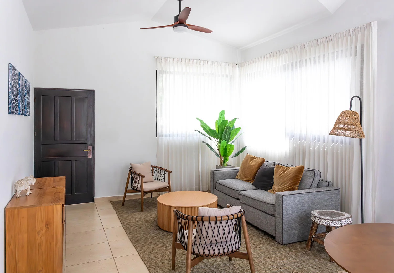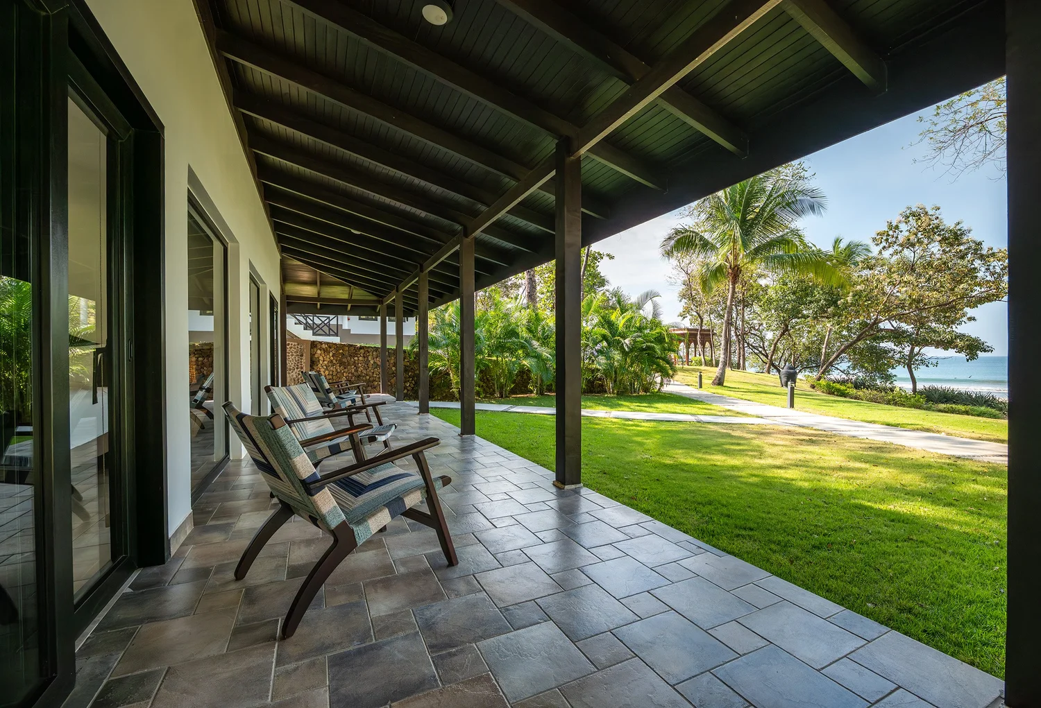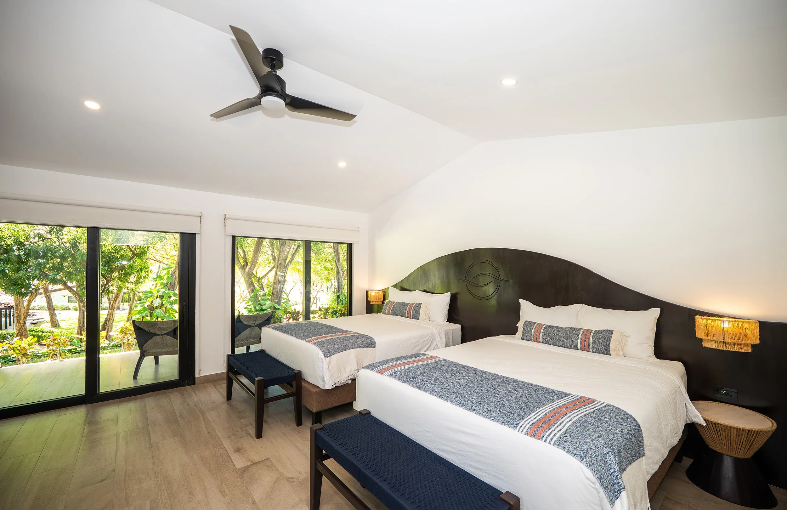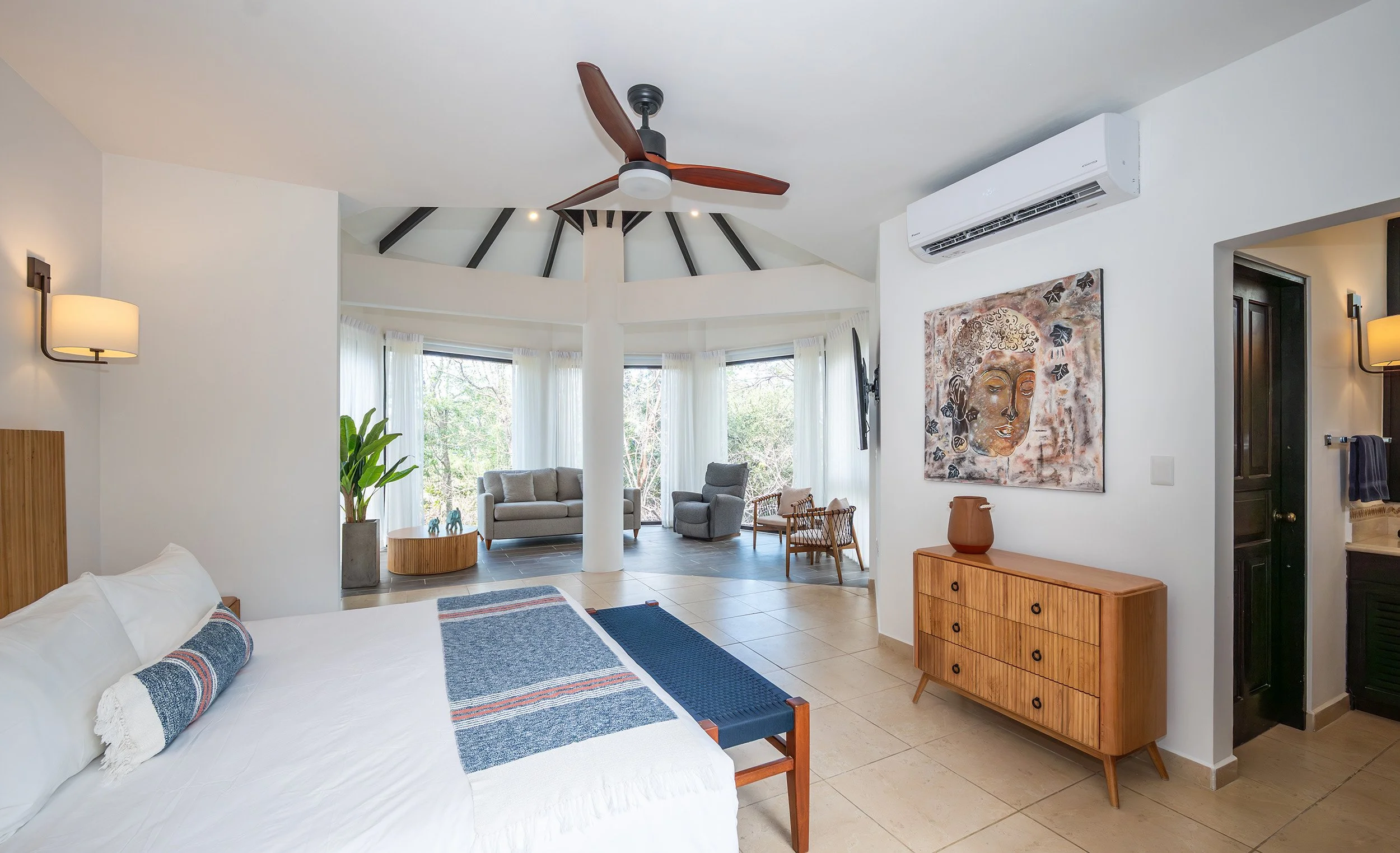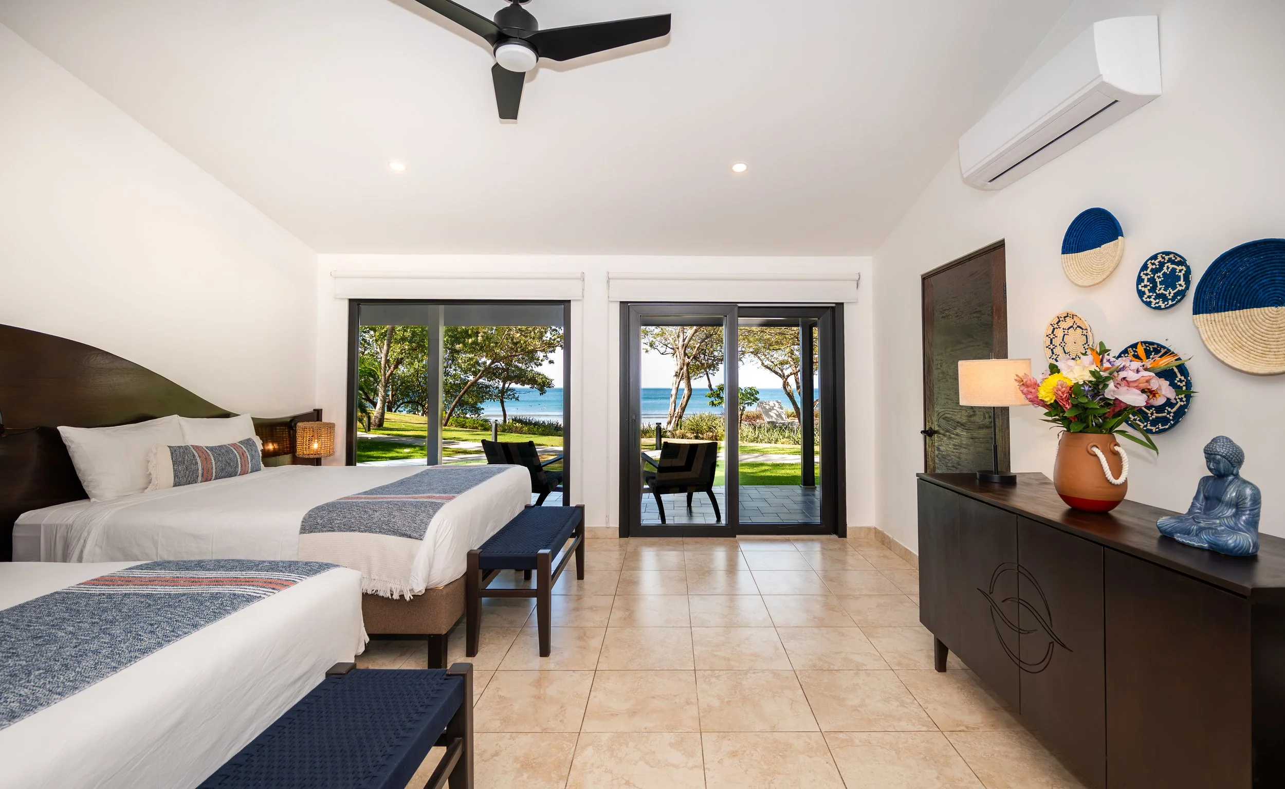 Light-filled and naturally soothing, rooms feature plush beds with soft cotton linens, private ensuite bathrooms, air-conditioning, and expansive porches that open to lush gardens or ocean views—seamlessly connecting indoor ease with the beauty of the land.